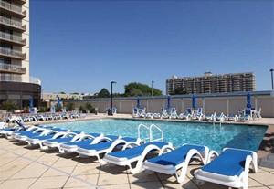 - Outdoor tables, lounge chairs, umbrellas, and upright seating provided
